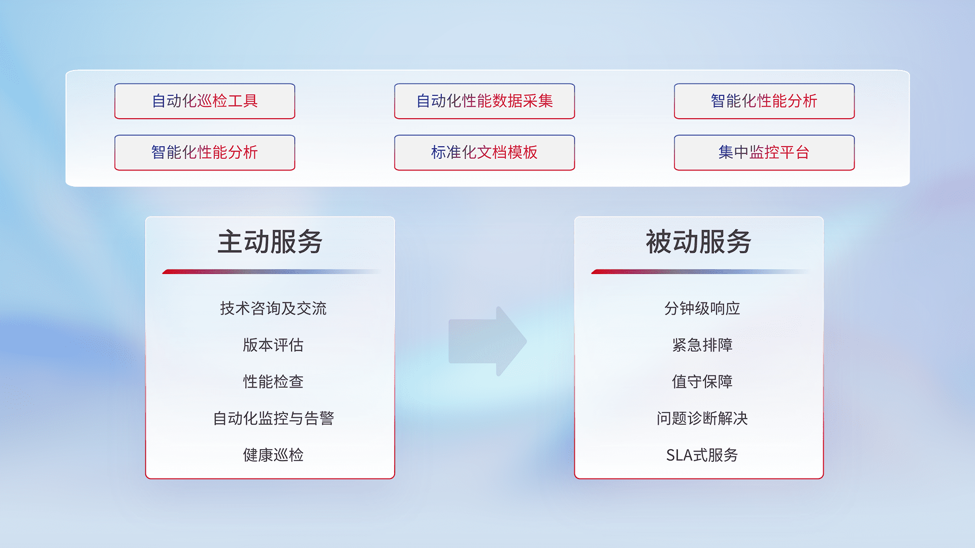 智能化工具和标准化文档,,保障服务质量,,,,提供主动服务(包含技术咨询、、、、版本评估、、性能检查、、、、自动化监控与告警、、、健康巡检)和被动服务包含(分钟级响应、、紧急排障、、、、值守保障、、、、问题诊断解决、、、、SLA服务)。。。。